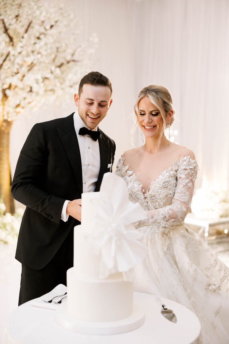 This all-white wedding design, adorned with shimmering silver accents, mirrored the bride’s breathtaking ball gown and created an enchanting atmosphere. As guests entered the reception, they were transported into a world of pure elegance, where cascading white florals and glimmering decor left them in awe. The stunning setup, with its luxurious details, truly took their breath away, making for a show-stopping celebration that will be remembered for years to come.